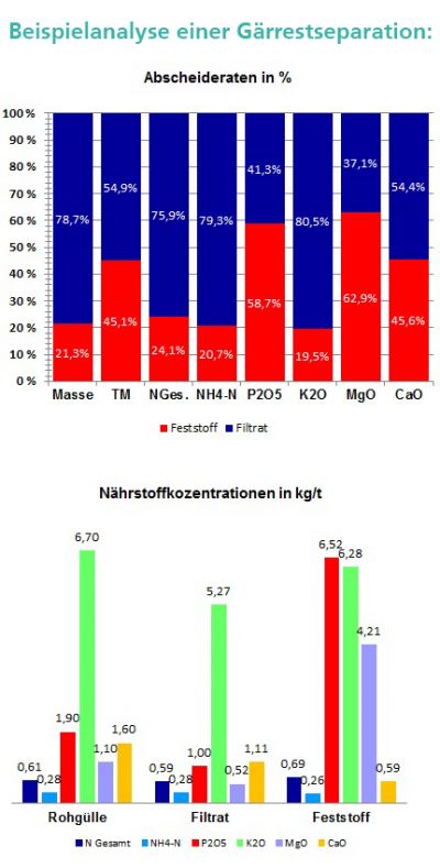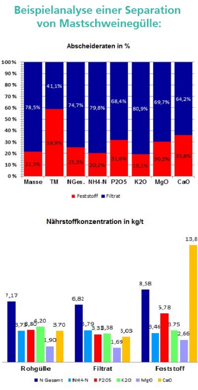 Zudem entsteht eine Mengenreduktion von bis zu 40%, sodass deutlich mehr Lagervolumen geschaffen werden kann. Die zu erwartenden Abscheideraten in die Festphase liegen abhängig von der Rohgüllebei 30-50% P und
